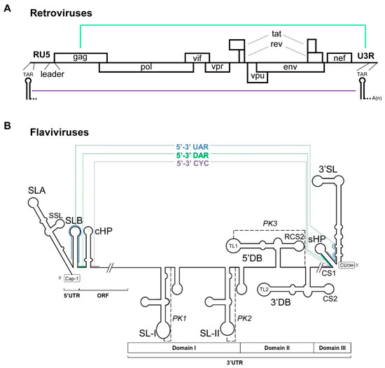 Long-range RNA–RNA contacts in representative RNA viruses with linear genomes. This figure shows the proposed conserved secondary structural elements and sequence motifs within the 5′ and 3′ ends of retroviruses, such as HIV-1 (A) and DENV-2 (representative of flaviviruses) (B) involved in genome circularization. The ORF and the UTRs (RU5 and U3R for retroviruses) are indicated. Thin colored lines denote long-distance RNA–RNA interactions between genomic termini. The pseudoknot elements (PK1, PK2, and PK3) are indicated by dashed black lines.