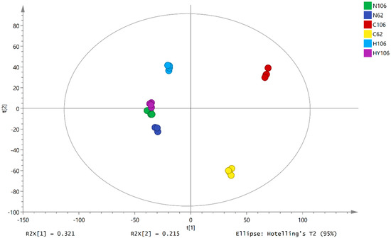 PCA score plots for different lettuce seed metabolomes. A five principle component-based PCA model (R2X (cum) = 0.774, Q2(cum) = 0.49) for GC/MS and UPLC-IMS-QTOF/MS data was obtained; the PCA analysis separated six different groups (N62: S13K0062 dry seeds; N106: S15K106 dry seeds; C106: buds of S15k0106 seeds germinated at 21 °C; C62: buds of S13k0062 seeds germinated at 21 °C; H106: S15K106 seeds fail to germination at 35 °C; HY106: buds of S15k0106 seeds germinated at 35 °C) and revealed differences in the relative content of metabolites present in different groups.