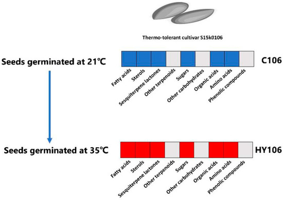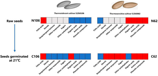 Due to its significance in both basic study and applied crop production, this fascinating phenomenon of thermoinhibition has been investigated for a long time. In the 1960s, researchers found that external factors such as light [7] and internal factors such as plant hormones [1,8] could alter seed germination under higher temperatures. ABA-related genes were more highly expressed when germination was inhibited, and GA- and ethylene-related genes were more highly expressed when germination was permitted [9]. In recent years, contemporary approaches, including genome sequencing, transcriptomics and proteomics have been deployed to gain insights of the complex nature of lettuce seed germination in response to heat stress [2,9,10]. A few key genes have been identified to be associated with the thermoinhibition of lettuce seeds. For instance, the upregulation of abscisic acid biosynthetic enzyme gene 9-cis-EPOXYCAROTENOID DIOXYGENASE4 results in germination thermoinhibition of lettuce seeds [3]. Considering that all thermoinhibition-affecting factors identified thus far will alter gene expression leading to synthesize or decompose certain metabolites, we intend to tackle this phenomenon from a different angle, using the metabolomic approach to gain information towards a better understanding of its mechanism.