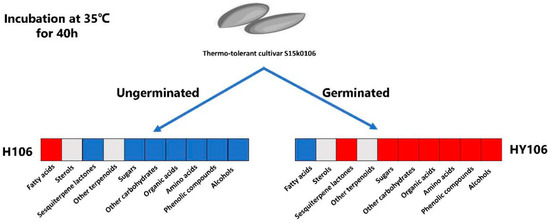 Differential metabolites detected between germinated buds and unterminated seeds of the thermal-tolerant lettuce cultivar. The heatmap indicates the differential metabolites between buds of S15k0106 germinated at 35 °C (HY106) and seeds of S15k0106 that did not germinate at 35 °C (H106). A red box means that most of the metabolites in this class had higher relative abundances in treatment compared to those in another, while a blue box represents that relative abundances of most of the metabolites in this class were lower in treatment than those in another; a gray box denotes no significance between H106 and HY106.