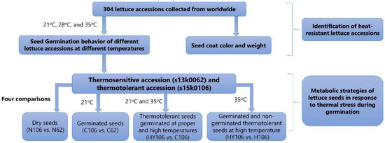 Four comparisons between different groups were set to investigate the difference in metabolomes between the two accessions of 1. dry seeds (N106 vs. N62, denoting ‘s15k0106′of and ‘s13k0062′, respectively); 2. the germinated seeds of the two accessions at 21 °C (C106 vs. C62); 3. the germinated seeds of ‘s15k0106′ at 21 °C and 35 °C (HY106 vs. C106); and 4) the seeds of ‘s15k0106′ germinated and non-germinated at 35 °C (HY106 vs. H106). The study design is shown in Figure 6.