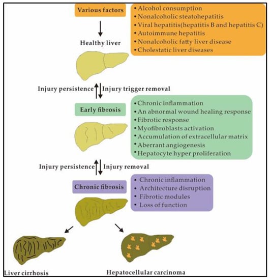 Liver fibrosis, a reversible wound healing response followed by excessive extracellular matrix (ECM) accumulation, is a major public health concern and is caused by increased synthesis and deposition of ECM components and decreased or unbalanced ECM degradation [,]. Furthermore, liver fibrosis is generated via continuous wound-healing reactions and liver damage caused by various chronic liver diseases, including non-alcoholic steatohepatitis (NASH), alcohol abuse, biliary obstruction, hepatitis B and C, and several other aetiologies [,] (Figure 1). Liver fibrosis may develop into a common final pathway of chronic hepatic diseases (e.g., cirrhosis and hepatocellular carcinoma), with a prevalence of 2–19% [,,]. Then, if this pathology cannot be eradicated, liver fibrosis progresses to cirrhosis and eventually to liver failure and malignancy []. Thus, analysis of the aetiology of liver fibrosis is important to prevent and treat hepatic fibrosis-related diseases.