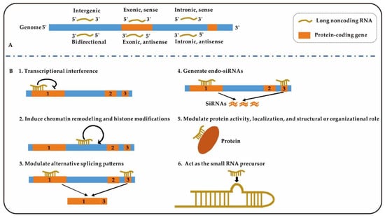 Classification and mechanisms of action of long noncoding RNAs (lncRNAs). (A), Classification of lncRNAs according to protein-coding genes; (B), Six mechanisms of “lncRNAs” in Figure 2.