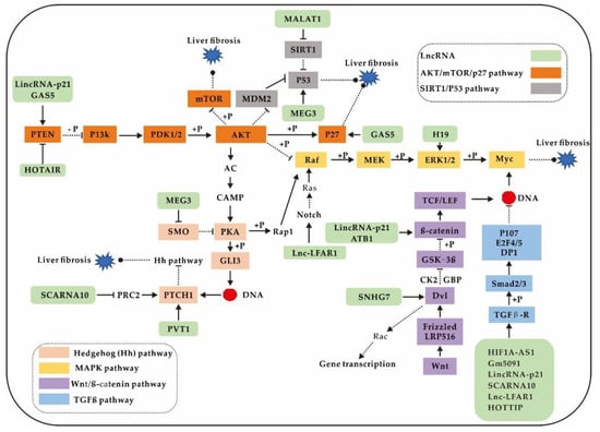 Another important pathway is the AKT/mTOR/p27 signalling pathway, which impacts downstream pathways, such as the P53 signalling pathway, the MAPK signalling pathway, and the Hh signalling pathway. LncRNAs are involved in regulating the activity of the above pathways (Figure 3). Specifically, HOTAIR can regulate the AKT/mTOR/p27 and P53 signalling pathways via PTEN methylation and MEG3 methylation, respectively [,]. Furthermore, GAS5 [,] and lincRNA-p21 [] regulate the AKT/mTOR/p27 signalling pathway as ceRNA-binding miRNAs. On the other hand, the Wnt signalling pathway plays important roles in liver fibrosis. LincRNA-p21 [] and ATB [] can competitively combine with miRNA to change the protein expression level of β-catenin.