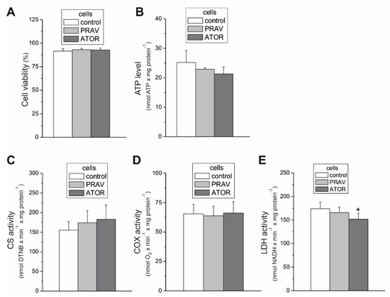 Cell viability (A), ATP level (B), maximal activities of marker enzymes of aerobic (C,D), and anaerobic catabolism (E) of endothelial EA.hy926, 100 nM atorvastatin (ATOR)-treated and 100 nM pravastatin (PRAV)-treated cells. Mean ± standard deviation (SD); n = 5; p < 0.05 (*), comparison vs. control values.