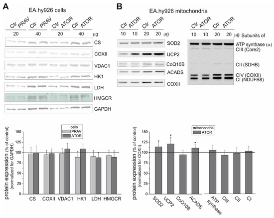 Representative Western blots (above) and analyses of the protein expression (below) in endothelial cells grown with 100 nM PRAV or 100 nM ATOR (A) and in mitochondria isolated from ATOR-treated cells (B). CS: citrate synthase; COXII: cytochrome c oxidase subunit II; VDAC 1: voltage-dependent anion-selective channel protein 1; HKI: hexokinase I; HMGCR: HMG-CoA reductase; GAPDH: glyceraldehyde 3-phosphate dehydrogenase; SOD2: superoxide dismutase 1; UCP2: uncoupling protein 2; ACADS: acyl-coenzyme A dehydrogenase; CoQ10B: mitochondrial coenzyme Q-binding protein CoQ10 homolog B; CI–CIV: complexes of respiratory chain. Mean ± SD; n = 5–10; p < 0.05 (*), comparison vs. control values.