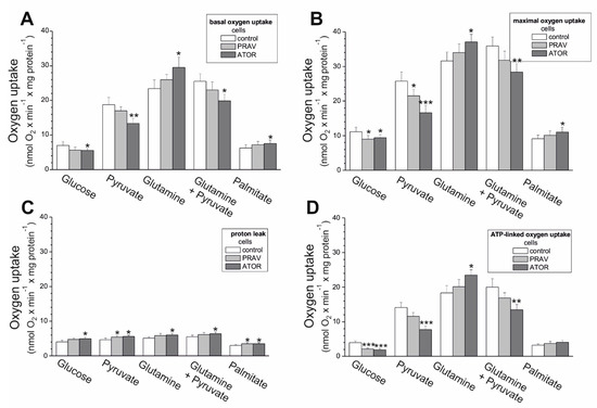 Oxidative metabolism of EA.hy926 cells grown with 100 nM PRAV or 100 nM ATOR. Substrate-dependent changes in the basal oxygen consumption rate (OCR) (A), maximal OCR (B), proton leak (C), and ATP-dependent OCR (D). Mean ± SD; n = 6; p < 0.05 (*), p < 0.01 (**), and p < 0.001 (***), comparison vs. control values.