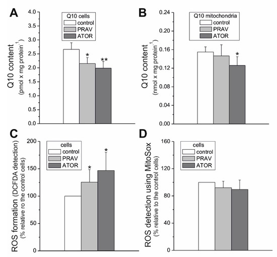 Cellular and mitochondrial Q10 content and ROS formation in endothelial cells grown for 6 days in the presence of 100 nM PRAV or 100 nM ATOR or under control conditions. Q10 concentration in endothelial cells (A) and mitochondria (B). Measurements of total cellular ROS using CM-H2DCFDA (C) and ROS formation with the MitoSox probe (D). Mean ± SD; n = 6-9. p < 0.05 (*), p < 0.01 (**), comparison vs. control values.