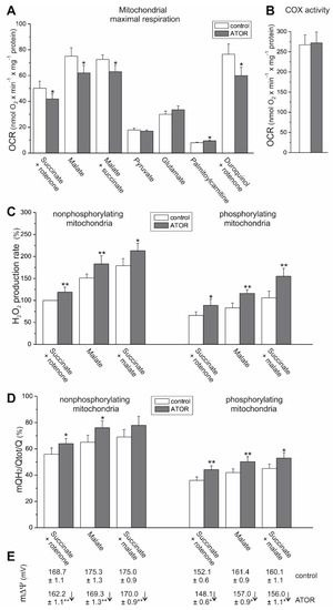 Comparing malate and succinate as respiratory substrates, in both mitochondria types, malate oxidation revealed higher mROS production, greater mQ10 reduction, and greater mΔΨ for both nonphosphorylating and phosphorylating conditions (Figure 5). In mitochondria from ATOR-treated endothelial cells, in addition to reduced malate-, succinate-, and malate/succinate-sustained maximal respiration (Figure 5A), a significant decrease in mΔΨ was observed under non-phosphorylating (~6 mV) and phosphorylating conditions (~4 mV) (Figure 5E). These changes were accompanied by an increase in H2O2 production by ~20% and ~40% (Figure 5C) and mQ10 reduction levels from 57%-68% to 63%-74%, and from 34%-43% to 44%-53% (Figure 5D) under nonphosphorylating and phosphorylating conditions, respectively.