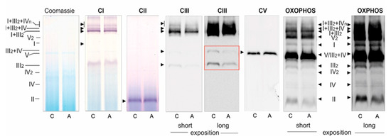 Blue Native (BN)-PAGE showing oxidative phosphorylation (OXPHOS) complexes and supercomplexes in mitochondria from control (C) and ATOR-treated (A) endothelial cells. Sequentially shown: Coomassie staining and destaining (loading control), CI in-gel activity, CII in-gel activity, CIII immunoblotting (short and long exposition), CV in-gel activity, and total OXPHOS immunoblotting (short and long exposition). CI–CIV: respiratory chain complexes I-IV; CV: ATP synthase.