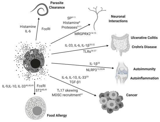 Mast cell activation paradigms. Mast cells and their simplified interactions with clinical diseases are represented with arrowed connections. Relevant MC-mediated soluble factors and associated signaling pathways are represented for each disease state. Subscripts correspond to relevant references from this review.