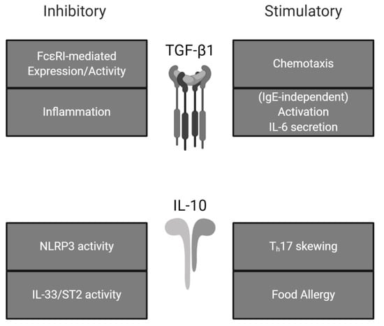 Effects of TGF-β1 and IL-10 on mast cell activity. TGF-β1 and IL-10 exhibit both stimulatory and inhibitory effects on mast cells. Summarized from the present review.
