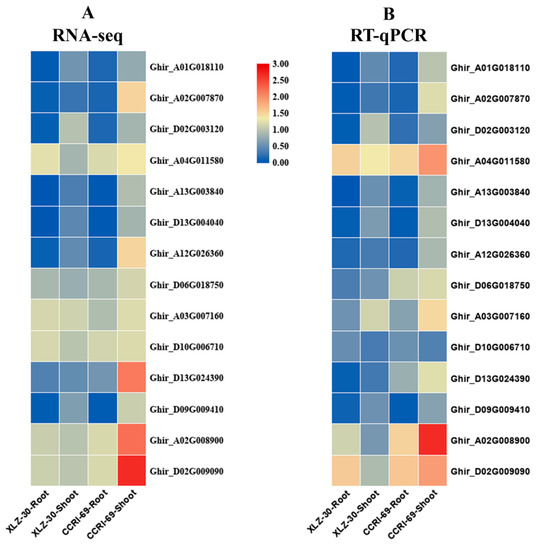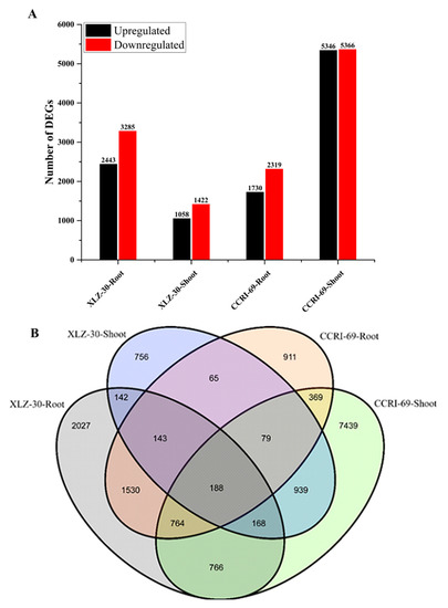 In RNA-Seq, the number of clean reads was 29,285,040, 22,859,989, 23,222,951, 23,584,486, 22,206,156, 21,816,409, 22,737,237, and 23,703,549 in T1, T2, T3, T4, T5, T6, T7, and T8, respectively, after trimming and filtering (Table 1). An average (based on three biological replicates) 5.99 gigabases (14×) of clean reads (Q30 > 94.34%) was obtained in these eight samples. The frequency of a >30 Phred quality score (Q30) was > 95.22% and the guanine-cytosine (GC) content > 44.88% for the eight samples. These findings attest to the fine quality of the sequencing results. The respective mapped reads information between root and shoot of XLZ-30-0h was: 91.37% and 96.38% total mapped; 4.31% and 4.96% multiple mapped; 87.10% and 91.42% uniquely mapped, respectively. Between root and shoot of XLZ-30-6h samples, 91.28% and 94.60% were total mapped, and 4.41% and 4.84% were multiple mapped, while 86.87% and 89.75% were uniquely mapped. Similarly, the respective mapped reads information between root and shoot of CCRI-69-0h was 93.23% and 91.41% total mapped; 4.43% and 5.03% multiple mapped; and 88.80% and 86.55% uniquely mapped, respectively. Between root and shoot of CCRI-69-6h samples 89.45% and 94.88% were total mapped, and 4.86% and 4.83% were multiple mapped, while 84.79% and 90.05% were uniquely mapped (Table 1). The transcriptome data were deemed suitable for subsequent analysis.