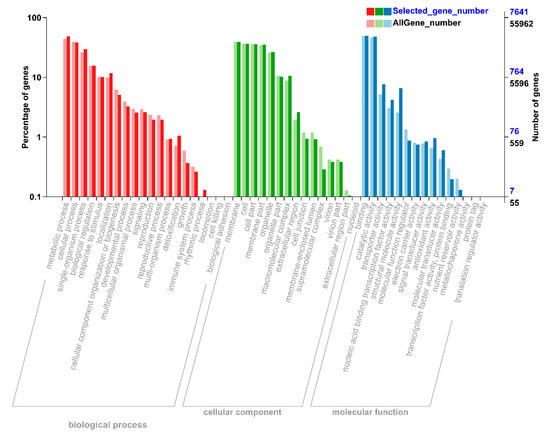 Differential annotation gene ontology (GO) annotation classification chart. The abscissa is the GO classification, the left side of the ordinate is the percentage of the number of genes, and the right side is the number of genes. This figure shows the background of the differentially expressed genes (DEGs) and the background of all genes. The DEGs were identified by pairwise comparisons between N-starvation and resupply treatments at p-value < 0.05. The gene enrichment of each secondary function of GO reflects the status of each secondary function in two contexts. The secondary function with obvious proportional difference indicates that the differentially expressed gene and the rich of all genes is rich.