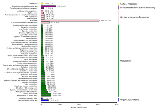 Based on the enrichment factors and Q-values, the DEGs were mapped to various metabolic pathways using a KEGG database analysis. There are five KEGG pathway categories: cellular processes, environmental information processing, genetic information processing, metabolism, and organismal systems. “Plant hormones signal transduction” was the only item enriched in environmental information. In regard to metabolism, “biosynthesis of amino acid and carbohydrate metabolism” was the most highly overrepresented, followed by “Phenylpropanoid biosynthesis” “cysteine and methionine metabolism”, “glycolysis/Gluconeogenesis”, “starch and sucrose metabolism”, “purine metabolism”, “nitrogen metabolism”, “alanine aspartate and glutamate metabolism”, and “oxidative phosphorylation”. “Ribosome” and “ribosome biogenesis in eukaryotes” were the only items enriched in genetic information processing. “Plant-pathogenic interaction” was the only item enriched in the organismal system. No enrichment was found in cellular processes (Figure 3). According to their analyses, these pathways explained the possible roles of these DEGs after nitrate starvation and resupply in the metabolism of cotton.