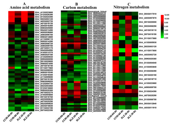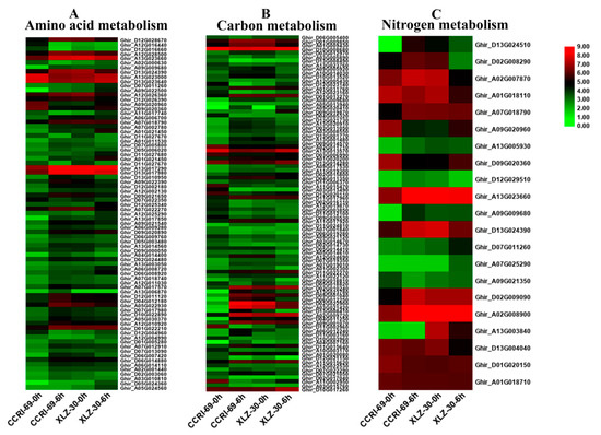 The expression patterns of genes involved in amino acid (A), carbon (B) and nitrogen (C) metabolism in shoot of two cotton genotypes. The heat map represents the relative expression levels of genes based on FPKM values using RNA sequencing (RNA-seq) data.