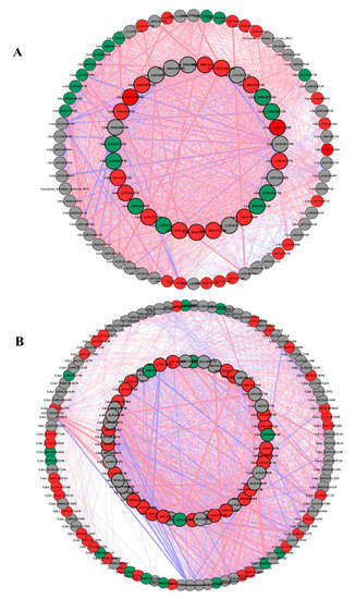 The Pearson correlation network reveals the regulatory mechanisms of amino acid, carbon, and nitrogen metabolism. (A) Coexpression network of genes in roots; (B) coexpression network of genes in shoots. Different colors of nodes represent amino acid (red), carbon (gray), and nitrogen (green). Red edges represent positive correlations and blue edges represent negative correlations. The thickness of each edge represents the value of the correlation coefficient for each correlated pair. Hub genes are highlighted with thick and black edging. The coexpression networks were made with p > 0.95 as the threshold.