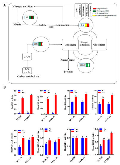 The DEGs of N metabolism pathway (A) and activities of key N assimilating enzymes (B) in the roots and shoots of CCRI-69 and XLZ-30 under N starvation and resupply treatments. The DEGs of the N metabolism pathway in the roots and shoots of CCRI-69 and XLZ-30 under N starvation and resupply treatments. The rectangles behind the gene, which were tagged with red, green, white, or yellow color, represent the upregulated DEGs, downregulated DEGs, unchanged DEGs, or the DEGs with inconsistent expression trend, respectively. N−, N starvation and N+, mean N resupply. NR, nitrate reductase (µg g−1 FW h−1); GS, glutamine synthetase (µmol g−1 FW h−1); GOGAT, glutamate synthase (U mg−1 protein); GDH, glutamate dehydrogenase (U mg−1 protein). Bars with different letters indicate significant difference (p < 0.05).