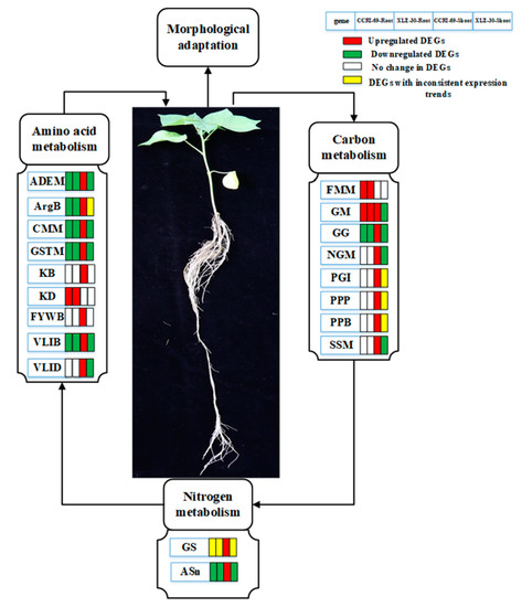 It has been noted that the transcription of six DEGs related to “glyoxylate and dicarboxylate metabolisms” were upregulated in the roots of CCRI-69 but not in XLZ-30 (Figure 4 and Table S1). The glyoxylate cycle is important for the biosynthesis of carbohydrates from fatty acids, and as a result, sucrose accumulation occurs in the plant tissues. Therefore, we may assume that the enhanced glyoxylate and dicarboxylate expression in the roots of the CCRI-69 may stimulate the biosynthesis of carbohydrates from fatty acid and carbon partitioning in favor of sucrose accumulation for counteracting N starvation upon resupply of nitrogen. The enhanced sucrose accumulation in CCRI-69 might be the reason for its strong root system as observed in the previous experiments [9]. In addition, 19 DEGs related to starch and sucrose metabolism were upregulated in the shoots of CCRI-69, indicating that CCRI-69 had a great potential to enhance carbon metabolism as compared to XLZ-30. Similar findings were observed in drought and low nitrogen stresses in other studies [46,47,48].