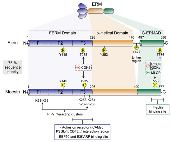 Schematic comparison of the conserved domain structure of human ezrin and moesin showing their sequence identity. The three subdomains (F1–F3) of the N-terminal band 4.1 protein ezrin, radixin and moesin (FERM) domain, the α-helical region, and the C-terminal ERM association domain (C-ERMAD) are depicted. Note that ezrin bears a linker region containing a regulatory Tyr (Y477) that is absent in moesin. The binding sites for PIP2, adhesion receptors and the PDZ domain-containing proteins EBP50 and E3KARP in the FERM domain, and for the F-actin binding site in the C-ERMAD, are shown together with the regulatory Tyr and Thr. Ser/Thr-specific ERM-associated kinases (CDK5, cyclin-dependent kinase 5; ROCK, Rho kinase; GCKs, germinal center kinases, e.g., LOK, lymphocyte-oriented kinase) and phosphatases (MLCP, myosin light chain phosphatase) are also depicted.