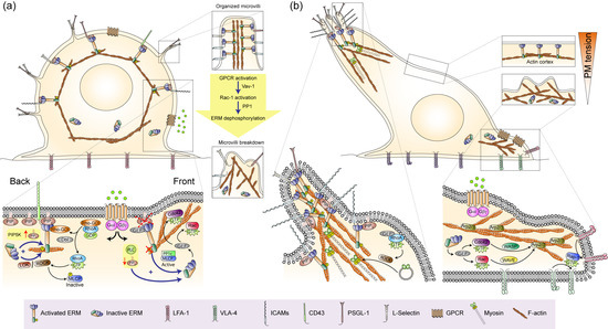 In leukocytes, polarization and migration are interconnected processes regulated by ERMs and their interaction with guanine nucleotide exchange factors (GEFs) and Rho GDP-dissociation inhibitors (RhoGDI) of the small Rho GTPases Rho, Rac and Cdc42 in the two major PM-associated compartments of polarized cells, the leading edge and the uropod [67,68]. These two cell poles are characterized by their respective clustering of chemoattractant receptors and enrichment of adhesion molecules on ERM-organized microspikes and microvilli [69,70]. Leukocytes egress from hematopoietic niches and lymphoid organs to patrol the organism following endothelial cell-presented adhesion receptors and chemoattractant trails that permit their exit from blood and lymphatic vessels and arrival to target tissues (e.g., secondary lymphoid organs and inflammatory foci) [71]. Leukocytes responding to chemoattractants convert mechanical forces into directional locomotion as a result of their marked front-to-rear polarity. Hence, Rac-dependent actin polymerization at the leading edge and retraction at the trailing edge by RhoA/ROCK/phosphorylated myosin light chain (MLC)-stimulated actomyosin contraction near the uropod are coordinately regulated by each other to maintain polarity and generate the main forces pushing leukocytes forward [72,73].