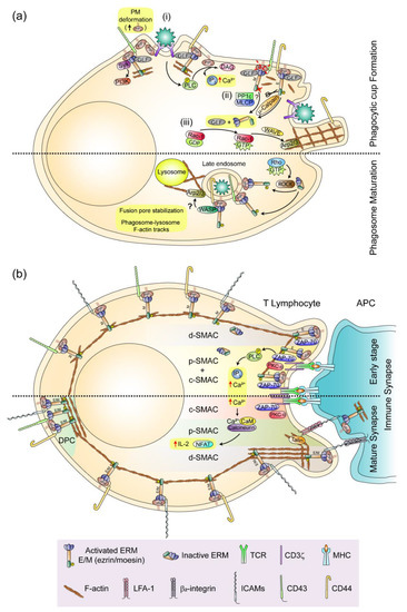 Although the phagocytic cup and IS are quite different structures in regard to the identity of the PM-associated receptors and cell types involved in their formation, they still share some important features [108]. Among them, it is worth noting the involvement of the actin cytoskeleton and ERMs in the dynamics of receptors driving their functional organization (Figure 3).