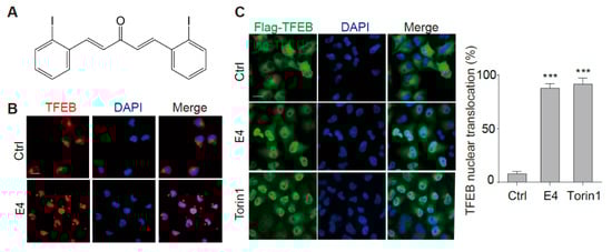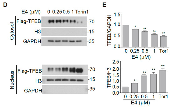 In normal conditions, TFEB locates in the cytoplasm. Being stimulated by various stresses, TFEB is de-phosphorylated and transported into the nucleus, where it binds to and activates multiple genes controlling autophagy and lysosomal biogenesis []. We monitored the localization of TFEB by immunostaining to determine whether compound E4 (Figure 1A) activates TFEB. E4 significantly promoted the nuclear intensity of endogenous TFEB in N2a cells (Figure 1B), and the stably overexpressed TFEB in HeLa cells (CF7) (Figure 1C). The TFEB activator Torin 1 was used as a positive control []. Furthermore, the result from Western blots of cytosolic/nuclear fractions confirmed that E4 activated TFEB (Figure 1D,E). No cytotoxicity was observed for E4 at the tested concentrations (Figure S1).