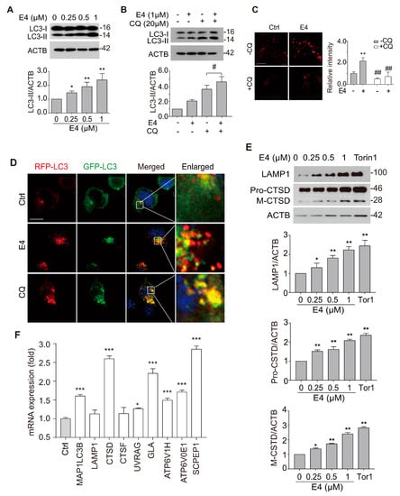 We next determined whether E4 enhances autophagy flux rather than causing lysosomal stress since lysosomal inhibition can activate TFEB []. First, we determined the effects of E4 on the autophagy maker LC3B. E4 dose-dependently increased the level of LC3B-II and the number of LC3B puncta determined by Western blot (Figure 2A) and immunostaining (Figure S2), respectively, in N2a cells, which indicated that E4 increases autophagosomes in cells. Secondly, in the presence of a lysosome inhibitor chloroquine (CQ) [], E4 further increased the LC3B-II level (Figure 2B), indicating that E4 promotes the formation of autophagosomes. Thirdly, in N2a cells that were transfected with a tandem fluorescent mRFP-GFP-LC3 (tfLC3) plasmid [], E4 treatment significantly increased the red-only puncta, whereas CQ treatment increased the yellow puncta (Figure 2D), thus further confirming that E4 promoted autophagy flux. For lysosome biogenesis, we found that E4 dramatically increased the lysosome contents, as determined by Lysotracker Red staining (Figure 2C), and increased the levels of LAMP1 and CTSD, as determined by Western blot (Figure 2E). At the gene level, E4 expectedly increased the mRNA levels of several autophagy and lysosome genes that were controlled by TFEB (Figure 2F).