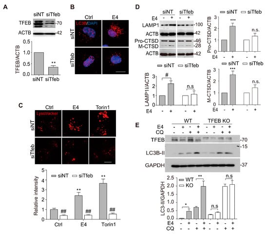 We knocked down TFEB in N2a cells using Tfeb siRNA to determine whether TFEB activation contributes to the enhanced autophagy and lysosomal biogenesis induced by E4. Efficient knockdown (KD) of TFEB was confirmed by Western blot (Figure 3A). TFEB KD significantly abolished E4-induced increase in LC3B puncta and Lysotracker intensity (Figure 3B,C). Meanwhile, E4-induced increase in LAMP1 and CTSD was also significantly inhibited in the TFEB KD cells (Figure 3D). Furthermore, we confirmed the roles of TFEB in E4-induced autophagy in HeLa cells with TFEB knockout (KO). In wild-type (WT) cells, E4 significantly increased the level of LC3B-II in the presence or absence of CQ. However, no significant change in LC3B-II was observed in KO cells that were treated with E4 as compared to the control (Figure 3E). Together, our results confirmed that compound E4 promoted TFEB-mediated autophagy and lysosome biogenesis in vitro.