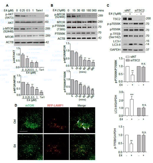 2.3. Compound E4 Activates TFEB Via Inhibiting AKT-MTORC1 Pathway