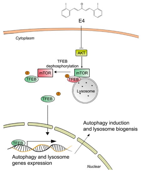Underlying mechanisms by which compound E4 activate TFEB and autophagy-lysosome process. Compound E4 inhibited AKT as well as MTORC1 pathway and further promoted the nuclear accumulation of TFEB. Cytoplasmic TFEB is highly phosphorylated and located in the surface of lysosome which bind with MTOR. Compound E4 inhibited the MTOC1 activity and promoted TFEB dephosphorylation. Dephosphorylated TFEB translocated into nucleus and bind to autophagy and lysosome related genes site. Eventually, compound E4 promoted TFEB from cytoplasm to nucleus and induced autophagy and lysosome biogenesis.