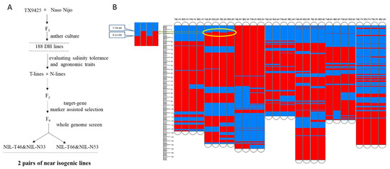 Construction of two pairs of NILs. (A): Strategy for developing NILs. (B): Comparison between genotypes of near isogenic (Pair 1: T46/N33; Pair2: T66/N53). Red: Naso Nijo backgrounds; blue: TX9425 backgrounds. Yellow circle: the major difference on 2H at the position of 6.6-9.4 cM for two pair of NILs.