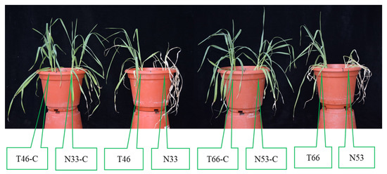 A DH population was constructed from the cross of TX9425 and Naso Nijo [26]. Two pairs of DH lines with similar agronomic traits but contrasting salinity tolerance were selected for crossing. Heterozygotes in the QTL region were screened for by the nearest marker bpb-6792 from F2 to F5 through marker assisted selection. In F6 plants, by screening phenotype (320 mM NaCl treatment at the two and a half leaf stage) and genotype (DArTseq analysis) to select two pairs of near-isogenic lines (N33 and T46, N53 and T66). T46 and T66 have a homozygous salt tolerance allele from TX9425, and N33 and N53 have a homozygous salt sensitive allele from Naso Nijo (Figure 1A,B).