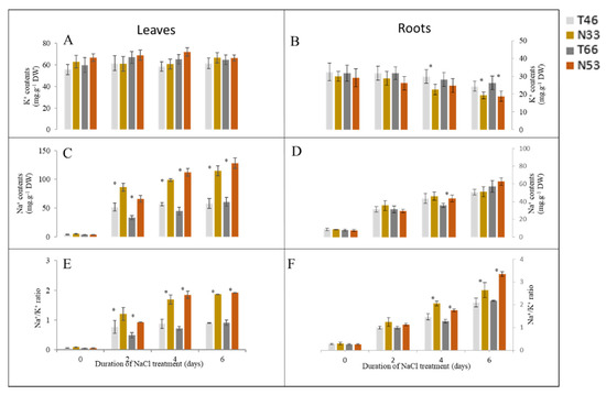 In roots, salinity exposure also resulted in an increased Na+ accumulation. However, no significant (at p < 0.05) difference was found between contrasting NILs for this trait (Figure 3D). Salinity treatment also resulted in a progressive decline in root K+ content in both NILs. This decline was much more pronounced in salt-sensitive lines (significant at p < 0.05; Figure 3B).