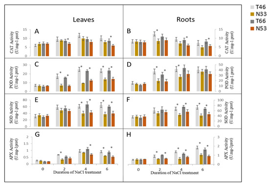 Antioxidant enzyme activities of leaves (A,C,E,G) and roots (B,D,F,H) from two pairs of NILs at 0, 2, 4, and 6 days after 300 mM NaCl treatment. * indicates significant differences among NILs (p < 0.05, Student’s t-test).
