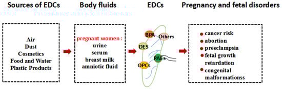 As shown in Figure 1, EDCs can enter pregnant women in different ways, e.g., through the food chain, the skin, or the respiratory tract. The mother may drink water or eat foods contaminated with EDCs. For example, phthalates are connected to polymer molecules through van der Waals forces and oxygen bonds in plastics products, which maintain relatively independent chemical properties of each other. With time, phthalates can slowly leak out of plastic products, into water, or food packaged in plastic [13]. Concentrations of BPA indoors have been estimated to be 1.46 mg/kg [14]. Mothers sometimes breathe dust in rooms with wallpaper or flooring containing EDCs or touch products made with BPA. A number of studies have revealed that some EDCs can be detected in the serum, amniotic fluid, breast milk, and urine of pregnant women [15,16]. Some of these may accumulate in placental tissues, and impair placental function, including plasticizers, organochlorine pesticides, personal care products, or naturally occurring EDCs found in plants. BPA exposure can significantly alter the methylation of imprinted genes in the mouse placenta, causing placental abnormality [17]. Clearly, the placenta is essential for the normal development and growth of the fetus. Subtle changes in placental function during the first trimester of pregnancy can change the fetal developmental trajectory, which affects various fetal physiological systems, such as the nervous system and immune system. Under this possible influence, the fetus is prone to disease, leading to congenital malformations [18]. Furthermore, chemical exposures to the mother may reach the fetus as a result of circulating blood through the placenta. Plasticizers such as phthalates and BPA have been reported to reach the fetus by blood circulating through the placenta because of the embryo’s lack of adequate defense mechanisms [19]. Non-persistent organic pollutants (non-POPs) were also detected in meconium samples, meaning that there is a limit to the ability of the placenta to act as a barrier to these chemicals and indicating that they had already reached the developing fetus and been absorbed [20]. Even relatively modest concentrations, some lipid-soluble chemicals, such as organochlorine pesticides, are able to pass the placental barrier, through a simple mechanism of passive diffusion. One study showed that after crossing the placental barrier, organochlorine pesticides can also pass through the blood-brain barrier of a still immature fetus [21]. Fetal exposure to EDCs has been associated with physical developmental, and eventually may adversely compromise their reproductive and hormonal systems, as well as cause cancer [22]. Although several adverse effects of EDCs have been reported in the reproductive process, most are focused on child growth and maternal health. The damages on the health of the placenta and fetus are unclear. Here, we review several major estrogen endocrine disruptors in the body fluids of pregnant women, then dissect the influences of placenta and fetal health in order to effectively prevent diseases caused by EDCs in mothers and fetus.