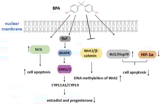 BPA action on placental growth. The arrow facing up indicates an increase, and the arrow facing down indicates a decrease, due to BPA. Bisphenol A increases the secretion of hCG and cell apoptosis, or activates the ERK signaling pathway to reduce estradiol and progesterone hormones, and also inhibits the expression of Wnt2/β-catenin. On the other hand, BPA can increase the levels of Bcl-2 and Hsp70 and reduce the level of HIF-1α to reduce apoptosis.