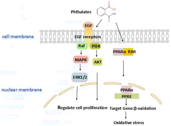 Phthalates are important synthetic chemicals which can induce toxicity, and the mechanism of the toxicity caused by phthalates needs to be further understood. Phthalates increase reactive oxygen species to alter the expression and activity of antioxidant enzymes that result in DNA damage [99]. As detailed in Figure 3, monoethylhexyl phthalate (MEHP), the reactive metabolite of phthalates, activates peroxisome proliferator-activated receptor (PPAR), and then combines with retinoid X receptor (RXR) [100]. Subsequently, they are transported to the nucleus, inducing gene expression and increasing oxidative stress. Oxidative DNA damage could inhibit the binding of methyl-CpG binding proteins (MeCP) and lead to epigenetic changes in chromatin organization [101]. MEHP exposure, inhibiting trophoblast invasion by activating PPARγ, is the most critical mechanism for early pregnancy loss [102]. Furthermore, placental ErbB signaling is one of the most important signaling pathways in response to DNA methylation and gene expression induced by phthalate exposure. This pathway works through tyrosine kinases, including two critical members, epidermal growth factor (EGF), and epidermal growth factor receptor (EGFR). The EGF signaling pathway activates numerous intercellular pathways that stimulate placental growth and function, including regulation of trophoblast cell proliferation, differentiation, and invasion [103,104]. Exposure to phthalates in early pregnancy alters placental transcriptome as a methylation change of critical placental DNA such as Insulin Growth Factor 2 (IGF2) [105]. This suggests that the pathway may be a potential target for endocrine disruption by phthalates.
