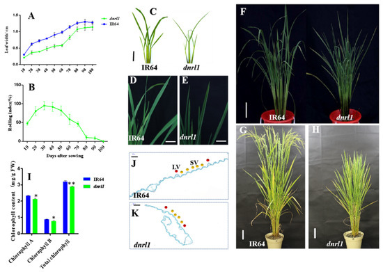Figure 1. Performance of dnrl1 under field conditions. (A) Leaf width of IR64 and dnrl1, the abscissa represents days after sowing; (B) dynamic leaf rolling index of dnrl1; (C-H) phenotype of IR64 and dnrl1 at 4 weeks old ((C); bar = 2 cm) and 9 weeks old (DF); (D) and (E), upper leaf blades of IR64 and dnrl1 (for (D) and (E), bar = 2 cm; for (F), bar = 5 cm); 14-week-old plants of IR64 and dnrl1 ((G) and (H), bar = 10 cm); (I) chlorophyll contents of IR64 and dnrl1 at 20 days after sowing (DAS). Values are means ± standard deviation (SD) (n = 3), * indicates significance at p ≤ 0.05, ** indicates significance at p ≤ 0.01 by Student’s t test.; (J) and (K), cross-section of IR64 and dnrl1 (for (J) and (K), bar = 200 μm), red dot indicates large vein (LV), yellow dot indicates small vein (SV).