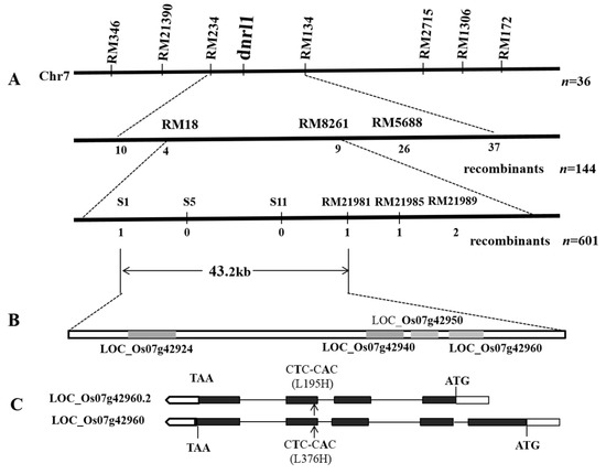 Figure 2. Map-based cloning of DNRL1. (A) The DNRL1 locus was first mapped to chromosome 7 between markers RM234 and RM134, then narrowed down to an approximately 161 kb region between RM18 and RM8261 using 144 F2 mutant type individuals from the cross of dnrl1/Moroberekan. The DNRL1 locus was further delimited to a 43.2 kb region between markers S1 and RM21981 using 601 F2 mutant type plants from the cross of dnrl1/Moroberekan; (B) a total of 4 ORFs (in gray box) were predicted in the region; (C) the candidate gene has two transcripts, LOC_Os07g42960 and LOC_Os07g42960.2 and a single nucleotide substitution from T to A at position 1127 of LOC_Os07g42960 and position 584 of LOC_Os07g42960.2. CDS were identified, respectively. Black boxes: exons; blank box: untranslated region; line: intron; arrow indicates the mutant site. Markers used for fine mapping are listed in Table S1.