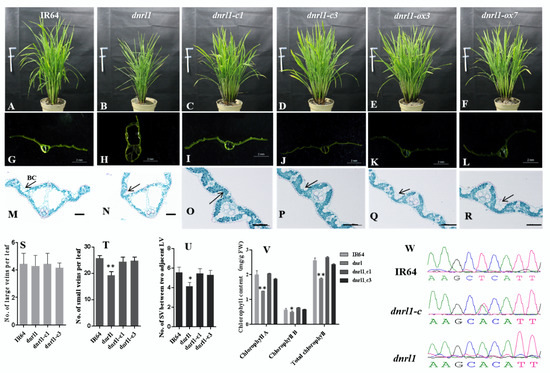 Figure 3. Functional complementation of the mutation. (AF) Nine-week-old IR64 (WT), dnrl1, complemented and over-expression plants, bar = 10 cm; (GL) leaf blade transverse section of (AF), bar = 2 mm; (MR) slice observation of (GL) (black arrow indicates bulliform cells, BC), for (M) and (N), bar = 50 μm; for (OR), bar = 100 μm); (S) number of LV per leaf; (T) number of SV per leaf; (U) number of SV between two adjacent LV; (V) chlorophyll contents of IR64, dnrl1, dnrl1-c1 and dnrl1-c3 at nine weeks. Values are means ±SD (n = 3); *indicates significance at p ≤ 0.05; ** indicates significance at p ≤ 0.01 by Student’s t test; (W) the nucleotide at the mutation site in IR64, dnrl1, and complemented plants.