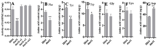 Figure 4. Comparison of 3-deoxy-7-phosphoheptulonate synthase (DAHPS) activity and amino acid contents. (A) DAHPS activity assay; (BG) amino acid contents of IR64 and dnrl1. Nine-week-old seedling leaves were used for the DAHPS activity assay and amino acid content determination. IR64, wild type; dnrl1, mutant; dnrl1-c1 and dnrl1-c3, complementation lines; dnrl1-ox3, over-expression line. Values indicate means ±SD (n = 3); * indicates significance at p ≤ 0.05; ** indicates significance p ≤ 0.01 by Student’s t test.