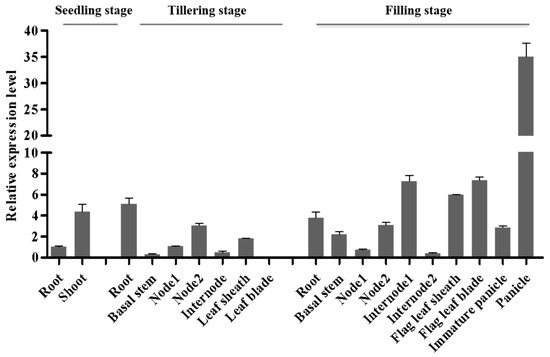 To clarify the expression pattern of DNRL1, quantitative reverse transcription polymerase chain reaction (qRT-PCR) analysis was performed using the total RNA derived from the roots, stems, internodes, leaves, leaf sheaths and panicles from IR64. The results showed that DNRL1 was expressed in all the organs tested with the highest expression level in shoots at the seedling stage, in roots at the tillering stage, and in panicles at the filling stage (Figure 5). The results showed that DNRL1 was constitutively expressed in rice.