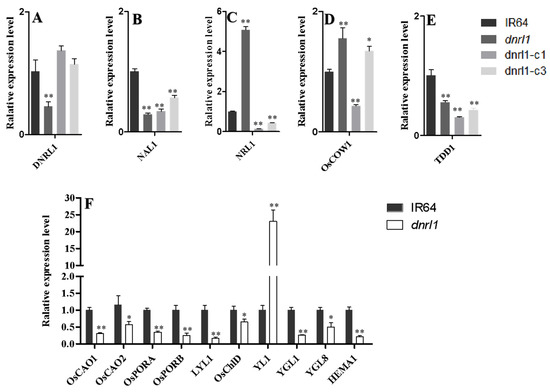 As mentioned above, dnrl1 was chlorophyll-deficient and showed a lower seed setting rate and 1000-grain weight compared with WT (Figure 1I, Table S2). We thus checked the expression level of genes associated with chlorophyll biosynthesis and photosynthesis in the mutant through qRT-PCR analysis. The results showed that 9 out of the 10 investigated chlorophyll synthetic genes (OsCAO1 and OsCAO2 encode chlorophyll a oxygenase; OsPORA and OsPORB encode NADPH-dependent protochlorophyllide oxidoreductase; LYL1 encodes geranylgeranyl reductase; OsChlD encodes the magnesium-chelatase D subunit; YGL1 encodes chlorophyll synthase; YGL8 encodes the catalytic subunit of magnesium-protoporphyrin IX monomethyl ester cyclase; and HEMA1 encodes glutamyl tRNA reductase) were downregulated in dnrl1 compared with WT (Figure 7F). We also carried out chloroplast ultrastructure observation on IR64, dnrl1, dnrl1-c1 and dnrl1-ox3, and found that there was no significant change in chloroplast morphology except that dnrl1 had a fewer number of chloroplasts compared with IR64 and dnrl1-c1 (Figure S1A). In addition, all seven photosynthesis or chloroplast biogenesis-related genes (OscpSRP54 encoding for the chloroplast signal recognition particle 54 kDa subunit; SPP encoding for the rice stromal processing peptidase; OsRpoTp encoding for plastid RNA polymerase; rpoA encoding for the plastid RNA polymerase alpha chain; PPR1 encoding for the chloroplast pentatricopeptide repeat protein; psbA encoding for photosystem II protein D1; and psaA encoding for photosystem I P700 chlorophyll A apoprotein A1) were significantly downregulated in dnrl1 compared with WT (Figure S1B). Our results clearly demonstrated that the DNRL1 mutation caused a huge variation in the expression of genes associated with chlorophyll biosynthesis and chloroplast development leading to the narrow-rolled leaf phenotype in dnrl1.