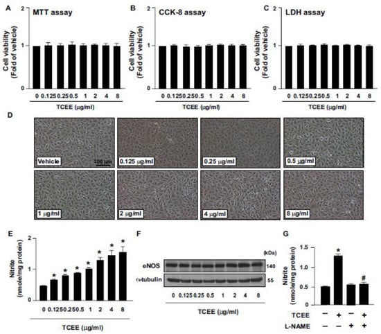 Effects of Torenia concolor Lindley var. Formosama Yamazaki ethanol extracts (TCEE) on cell viability and NO bioavailability in ECs. ECs were treated with the indicated concentrations (0.125-8 μg/mL) of TCEE for 24 h. (A–C) The cell viability by MTT assay, CCK-8 assay, and LDH assay. (D) Microscopic analysis of cells. (E) The level of nitrite in culture medium by Griess assay. (F) Western blot analysis of total eNOS and α-tubulin. (G) ECs were pretreated with L-NAME (400 μM) for 2 h, and then with TCEE (2 μM) for 24 h. The level of nitrite in the culture medium was measured. Data are mean ± SEM from 5 independent experiments. * p < 0.05 vs. vehicle-treated group; # p < 0.05 vs. TCEE-treated group.