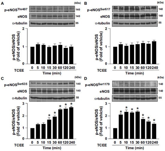 TCEE induces endothelial NO synthase (eNOS) activation in ECs. ECs were treated with TCEE (2 μg/mL) for the indicated times. (A–D) Cells were lysed and subjected to Western blot analysis for quantifying the levels of phosphorylated eNOS (at Thr495, Ser617, Ser635, and Ser1177) or total eNOS protein. Data are mean ± SEM from 5 independent experiments. * p < 0.05 vs. vehicle-treated group.