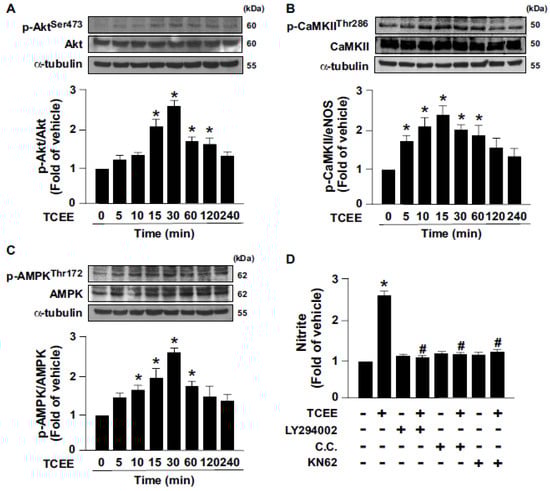 Akt-CaMKII-AMPK signaling is involved in the TCEE-mediated enhancement of NO bioavailability in ECs. (A–C) ECs were treated with TCEE (2 μg/mL) for the indicated times. Western blot analysis of phosphorylated or total of Akt, CaMKII, and AMPK and α-tubulin. (D) ECs were pretreated with LY294002 (10 μM), compound C (C.C., 10 μM), or KN62 (10 μM) for 2 h, and then with TCEE (2 μg/mL) for 24 h. Griess assay of the nitrite level in the culture medium. Data are mean ± SEM from 5 independent experiments. * p < 0.05 vs. vehicle-treated group; # p < 0.05 vs. TCEE-treated group.