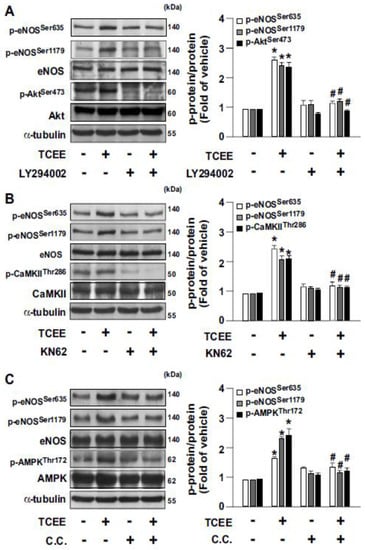 The up- and downstream relationships of the Akt, CaMKII, and AMPK signaling cascade in TCEE-treated ECs. (A–C) ECs were pretreated with LY294002 (10 μM), compound C (C.C., 10 μM), or KN62 (10 μM) for 2 h, and then with TCEE (2 μg/mL) for 30 min. Western blot analysis of phosphorylated or total of Akt, CaMKII, AMPK, eNOS, and α-tubulin. Data are mean ± SEM from 5 independent experiments. * p < 0.05 vs. vehicle-treated group; # p < 0.05 vs. TCEE-treated group.