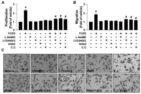 The signaling cascade involved in the TCEE-induced promotion of EC proliferation and migration. ECs were pretreated with LY294002 (10 μM), compound C (C.C., 10 μM), or KN62 (10 μM) for 2 h, then with TCEE (2 μg/mL) for 8 h. (A) MTT assay of EC proliferation. (B,C) EC migration was evaluated by the trans-well assay after TCEE treatment. The number of migrating cells was counted compared to the case for the vehicle-treated cells, and the images were generated by microscopy. Data are mean ± SEM from 5 independent experiments. * p < 0.05 vs. vehicle-treated group; # p < 0.05 vs. TCEE-treated group.