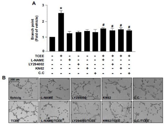 The signaling cascade involved in TCEE-induced promotion of EC tube formation. ECs were pretreated with LY294002 (10 μM), compound C (C.C., 10 μM), or KN62 (10 μM) for 2 h or l-NAME (400 μM) for 1 h, then with TCEE (2 μg/mL) for 8 h. (A,B) ECs were cultured in the attachment matrix in the indicated treatments. Tube formation was visualized; the bar graphs indicate the branch points as a fold of those in case of the vehicle-treated control in five randomly selected microscopic fields. Data are mean ± SEM from 5 independent experiments. * p < 0.05 vs. vehicle-treated group; # p < 0.05 vs. TCEE-treated group.